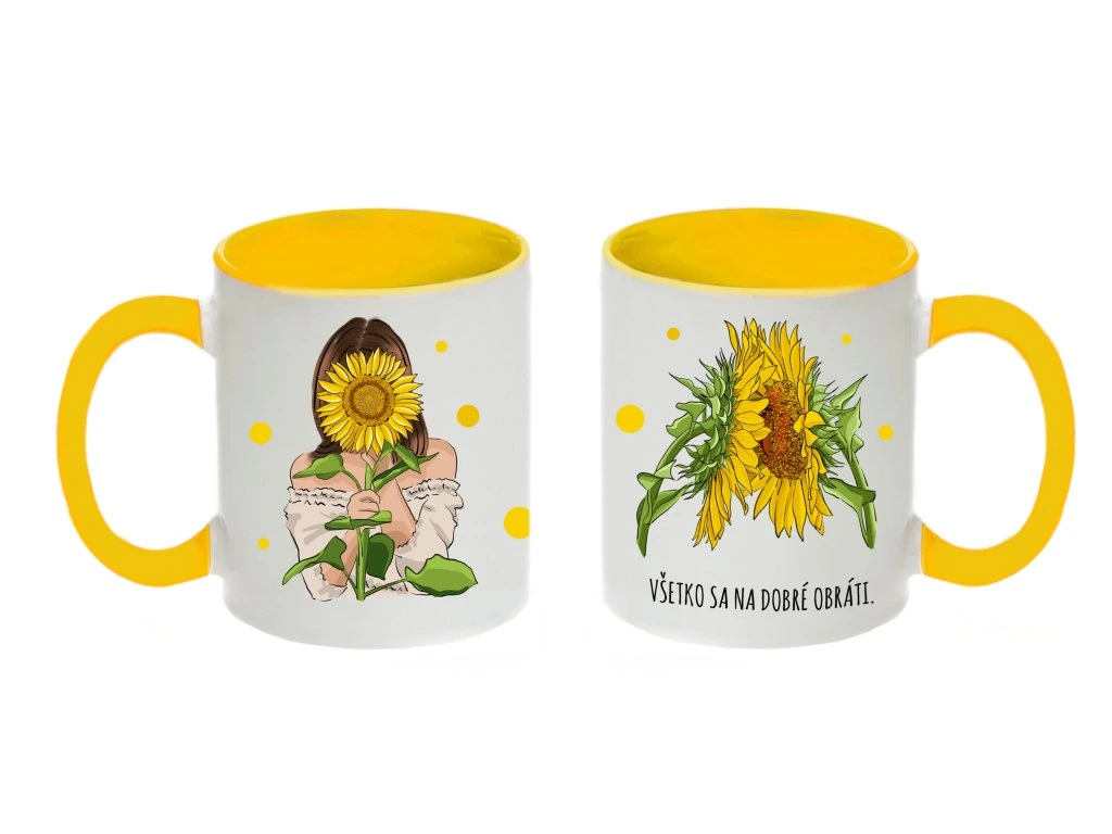 - Biela šálka s farebným uškom a vnútrom potlačená po celom obvode