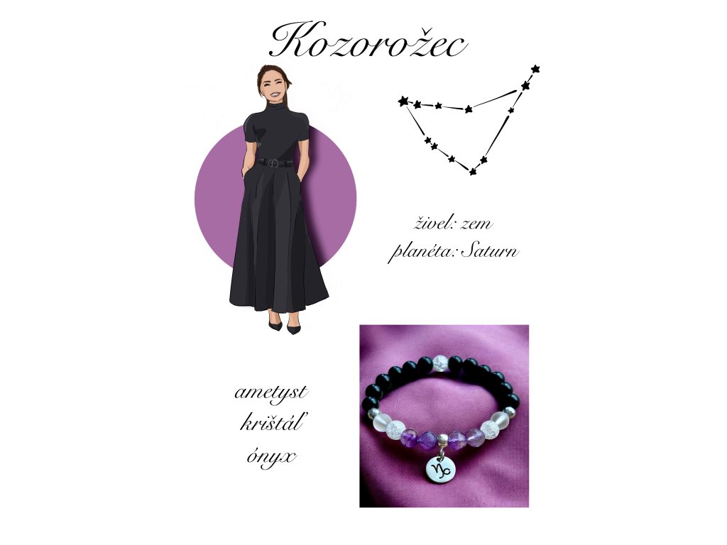 - kartička veľkosti A6 na veľmi tvrdom papieri s ilustráciou špeciálne pre toto znamenie, z druhej strany kartičky je popis kameňov, z ktorých je náramok vytvorený