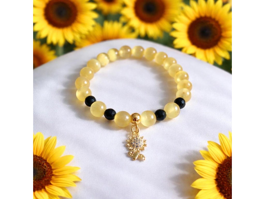 Náramok z 8 mm minerálnych kameňov s príveskom slnečnice na silikónovej gumičke.