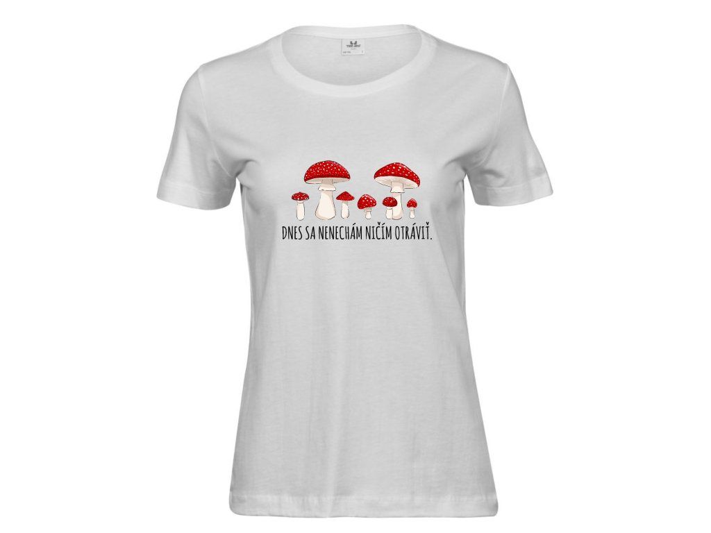 Biele nepriesvitné tričko dámskeho strihu s potlačou na prednej strane.