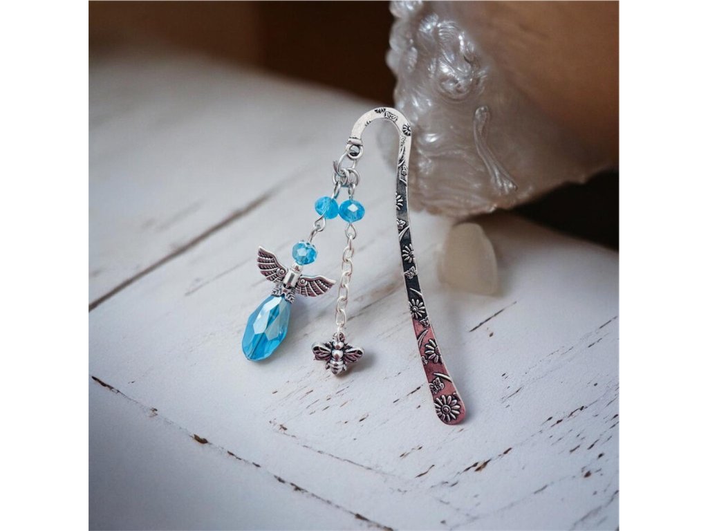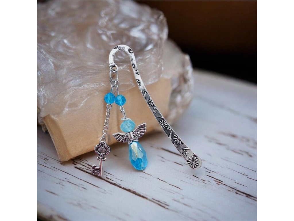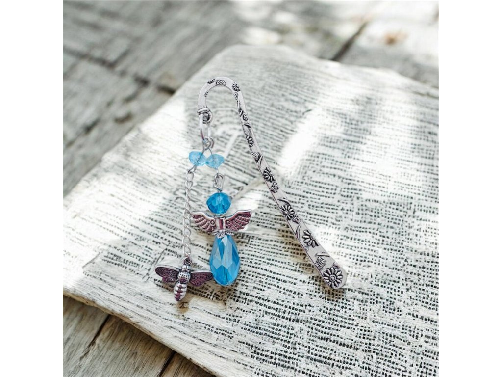 Záložka do knižky s dizajnom anjelika svetlomodrej farby a rôznymi príveskami.