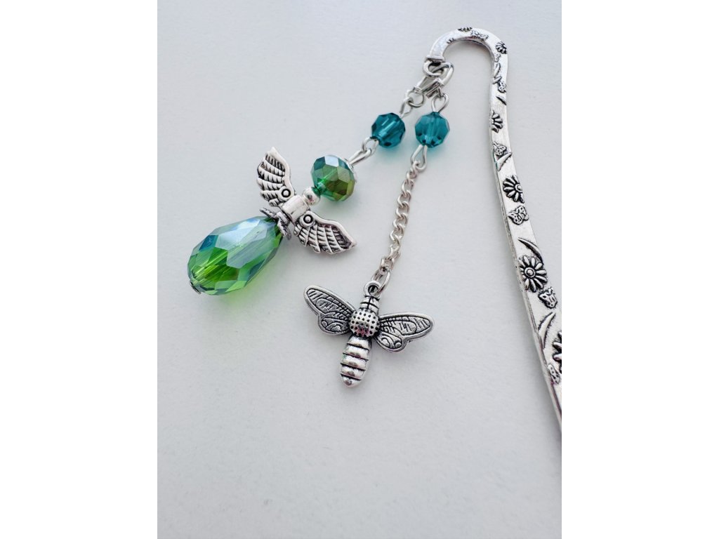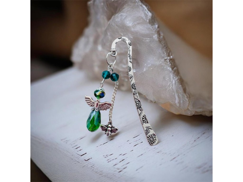Záložka do knižky s dizajnom anjelika zelenej farby a rôznymi príveskami.