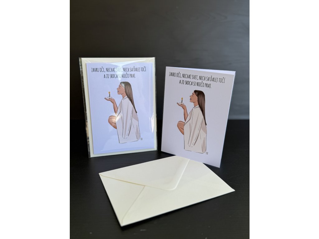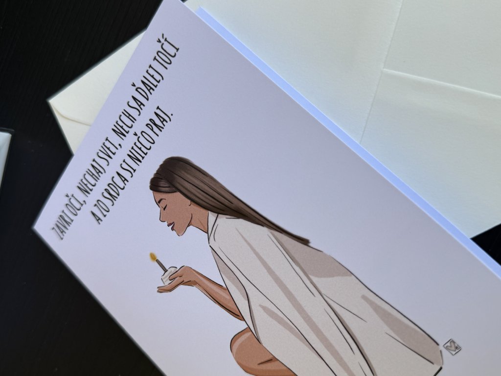 - Otváracia pohľadnica s obrázkom a textom na prednej strane.